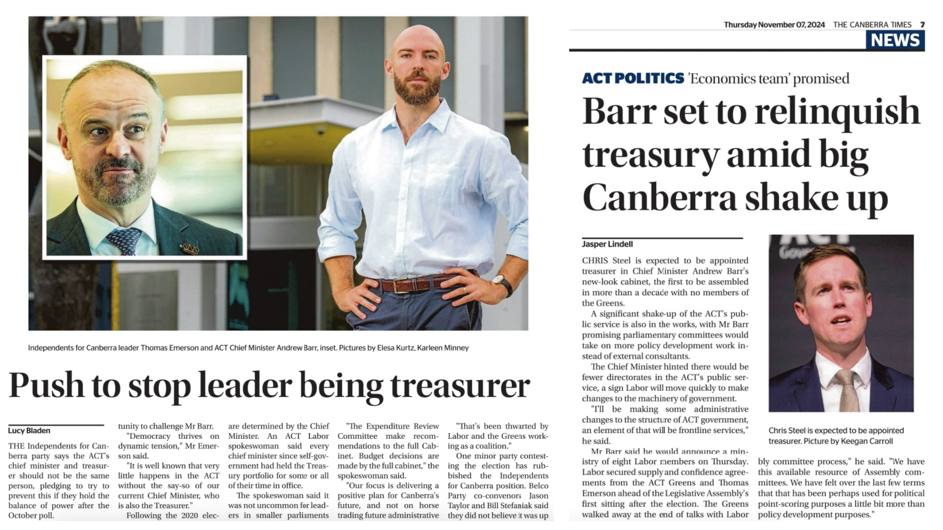 We made a strong case during our campaign for a separation of powers between the Chief Minister and Treasurer. Andrew Barr had held both of these positions concurrently for 10 years - before handing Treasury over to Chris Steel today.