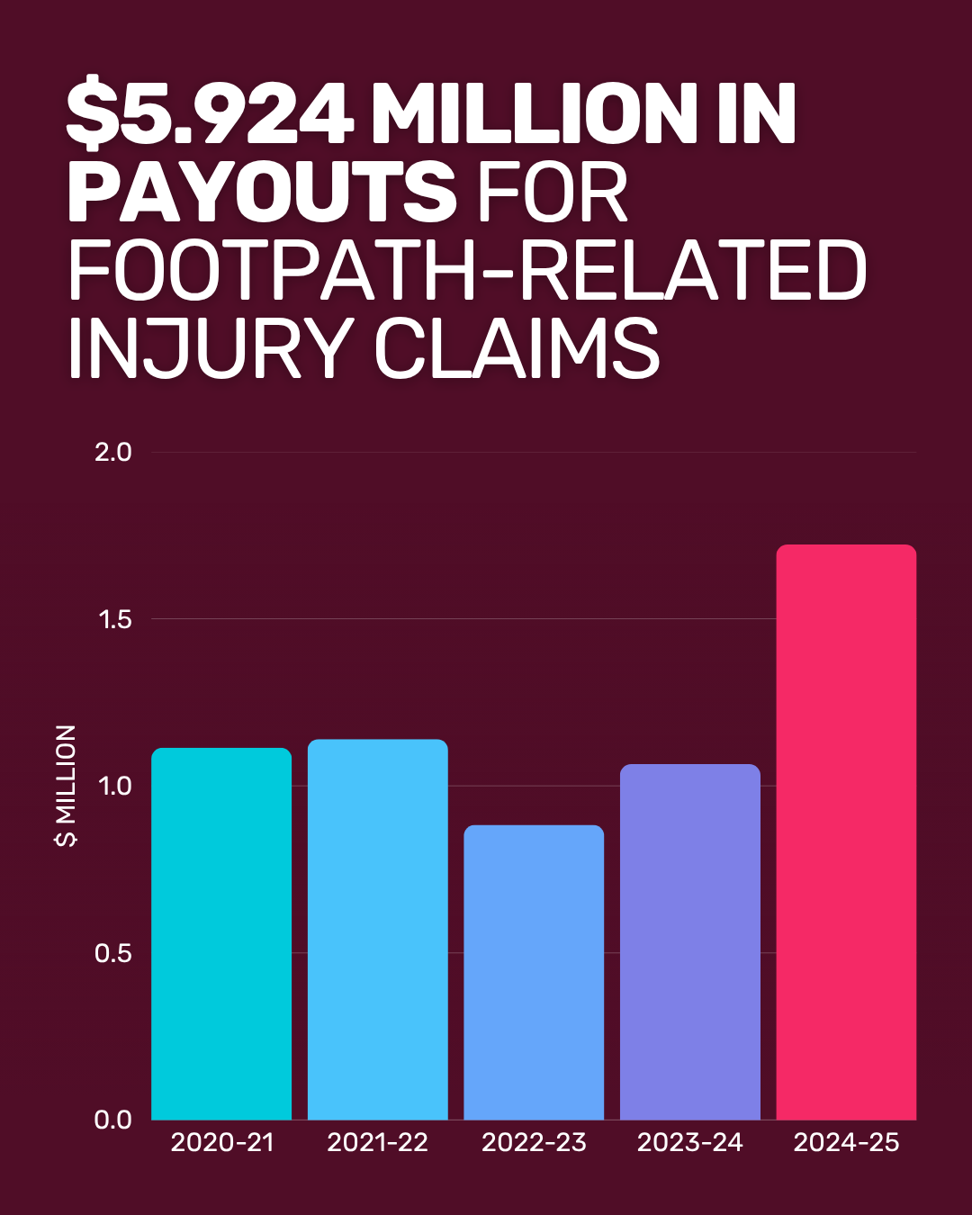 Last year, the ACT Government spent $2.3 million on legal costs and damages for personal injury claims related to damaged footpaths, compared to $6.6 million on actually repairing and maintaining footpaths. That means more than a quarter of expenditure on damaged footpaths wasn’t spent on fixing them, but on the legal consequences of not having fixed them in time!